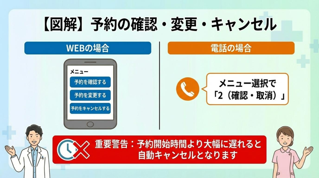 • WEBの場合:メニュー画面から「予約を確認する」「予約を変更する」「予約をキャンセルする」を選択して操作してください 。